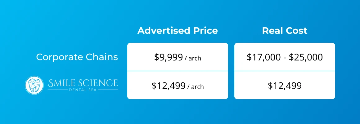 We’re not corporate – we’re personal. We believe in clinical honesty and a comprehensive solution based on your anatomy at a price that you can afford. At Smile Science Dental Spa, most patients needing a new set of fixed teeth will pay $12,499 per arch. Click here to browse our transparent All-On-4 treatment tiers.